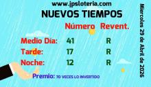 ¡¡¡ YA TENEMOS LOS ÚLTIMOS RESULTADOS DE LOTERÍA JPS !!! Comprueba desde está página tus boletos de los sorteos de la lotería de Costa Rica. Te ofrecemos los resultados actualizados correspondientes a todos los sorteos de la Lotería de la Junta de Protección Social. Podrás comprobar tus boletos del Lotto, Lotería Nacional y Chances. Te deseamos mucha, mucha, mucha suerte y ojalá seas ganador en alguno de los juegos. Las fechas de los últimos sorteos son Miércoles 29 de Abril de 2026, para Nuevos Tiempos, Miércoles 29 de Abril de 2026 para 3 Monazos, Miércoles 29 de Abril de 2026 para el Lotto y su Revancha, Domingo 26 de Abril de 2026 para Lotto y su Revancha y Martes 28 de Abril de 2026 para Lotería Popular.
