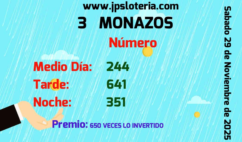 Como complemento de toda la información ofrecida anteriormente, te ofrecemos poder visualizar el vídeo del sorteo del Canal en YouTube del sorteo de 3 Monazos del Sábado 29 de Noviembre de 2025.